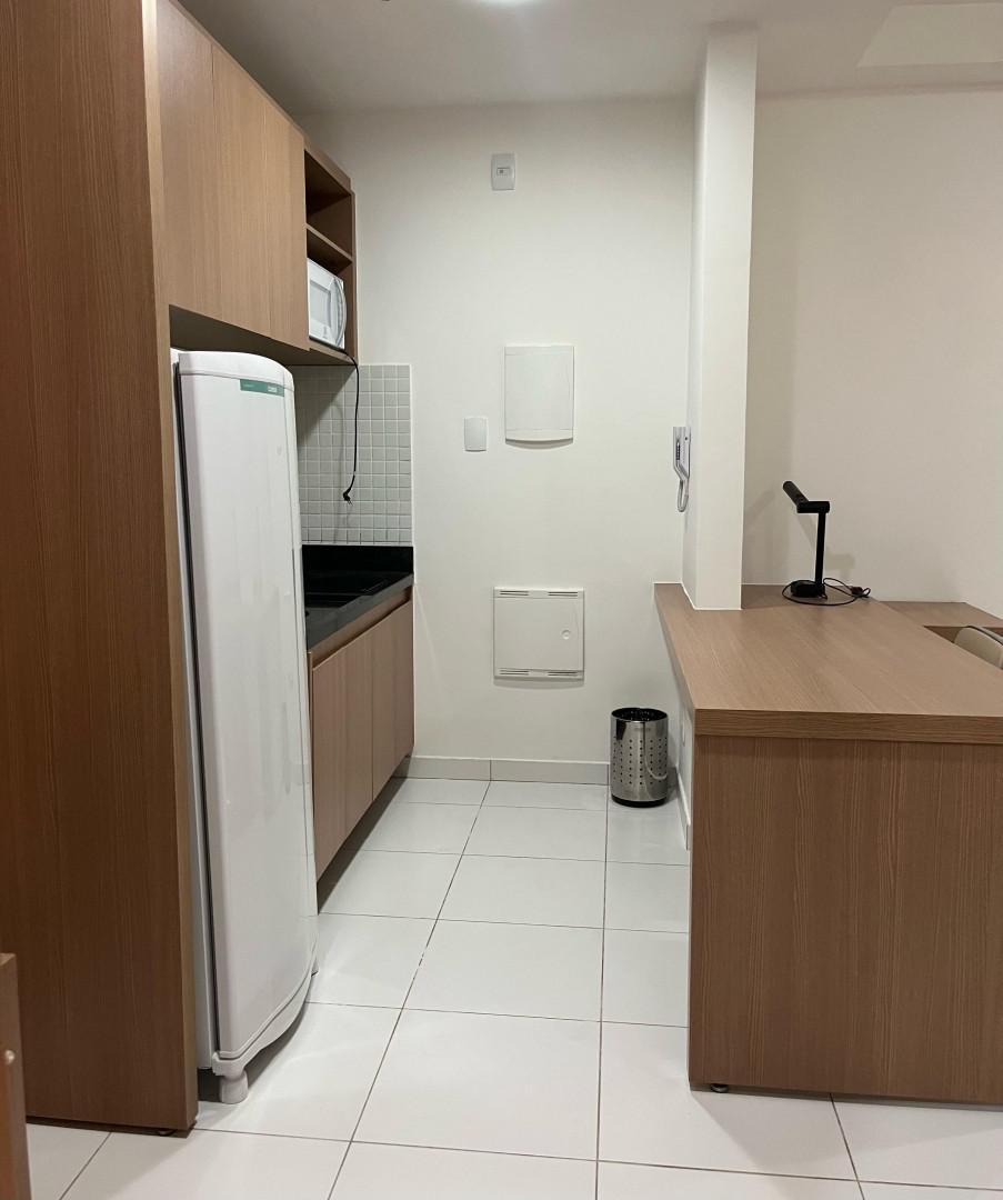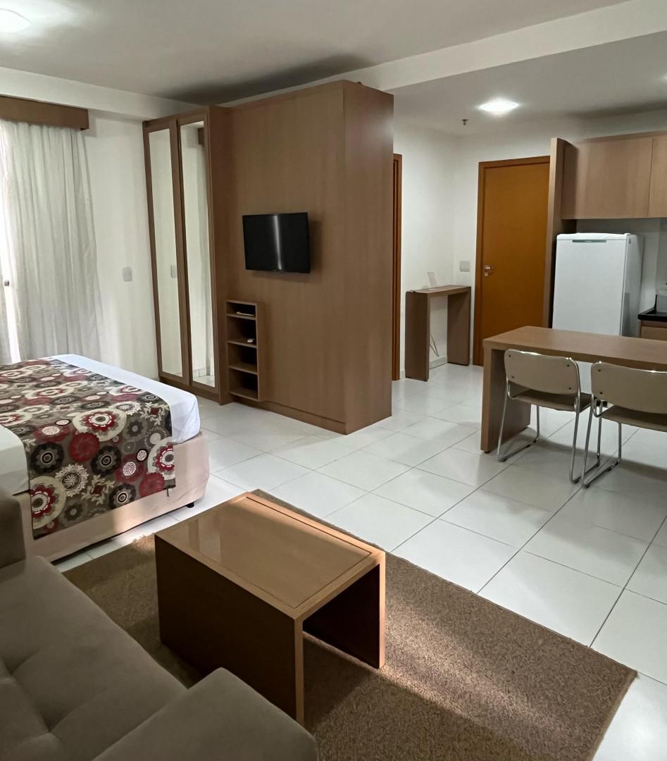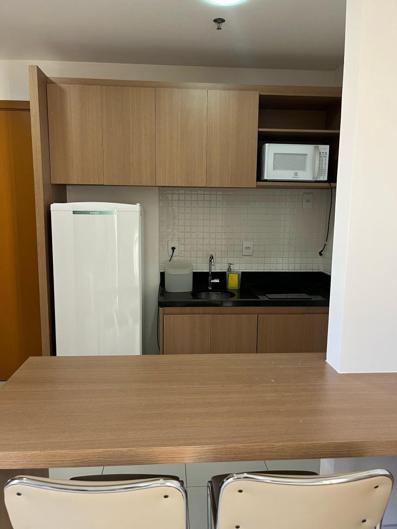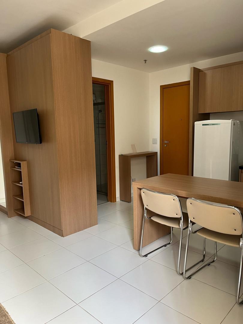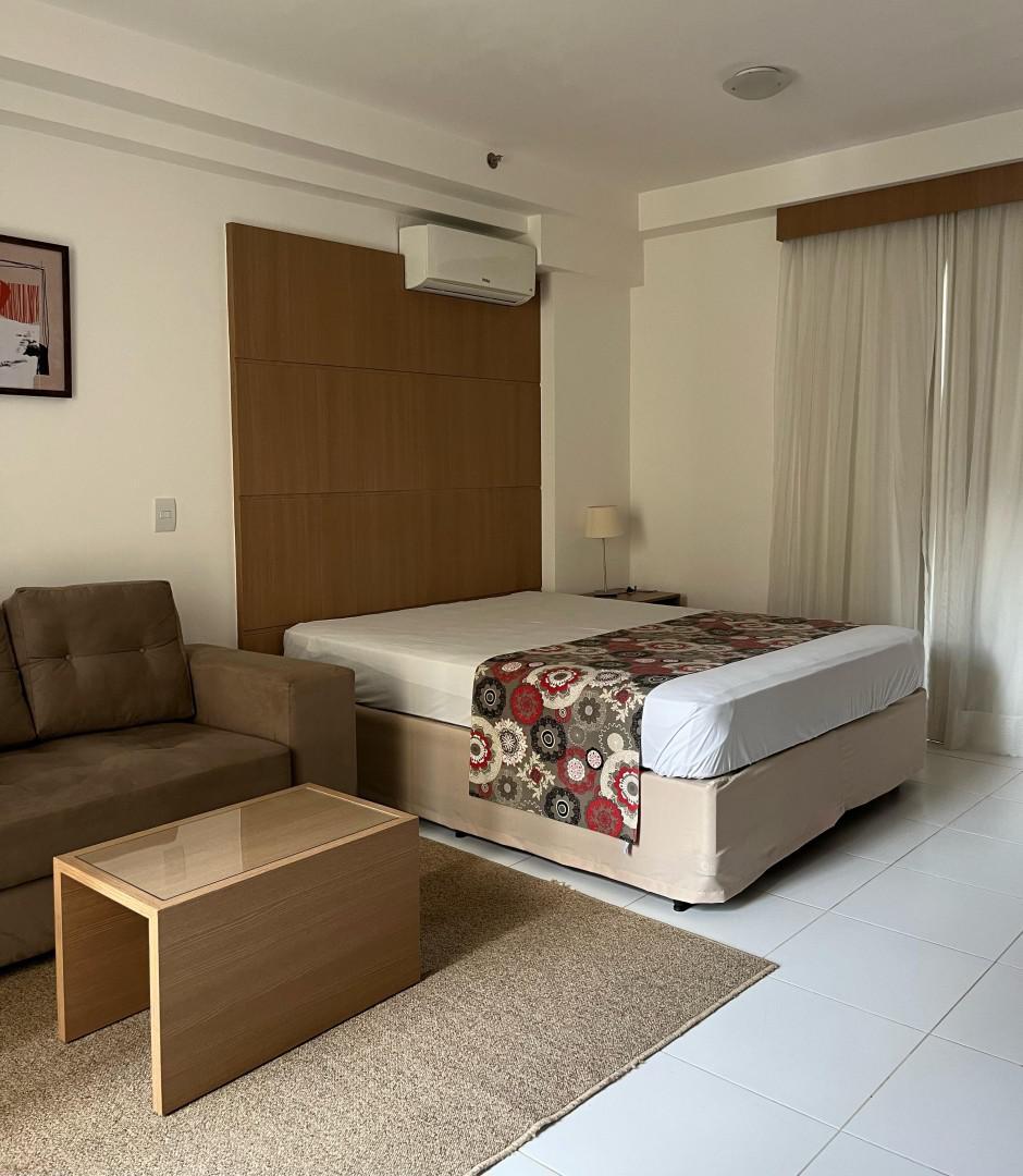O apartamento conta com: Cama Box Casal, TV, Sofá, Ar-condicionado, Geladeira, Cooktop, Armários planejados no quarto, cozinha e banheiro