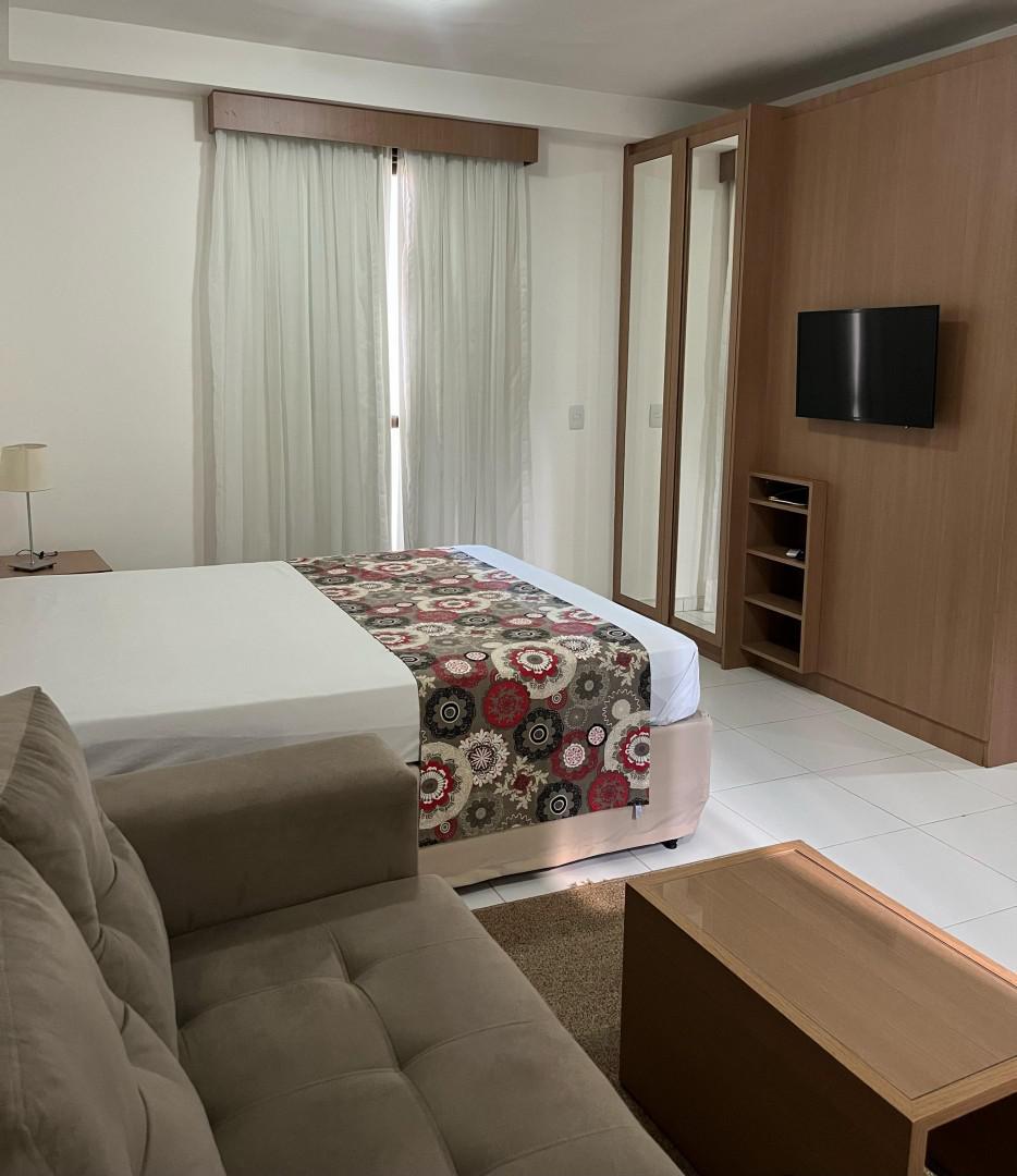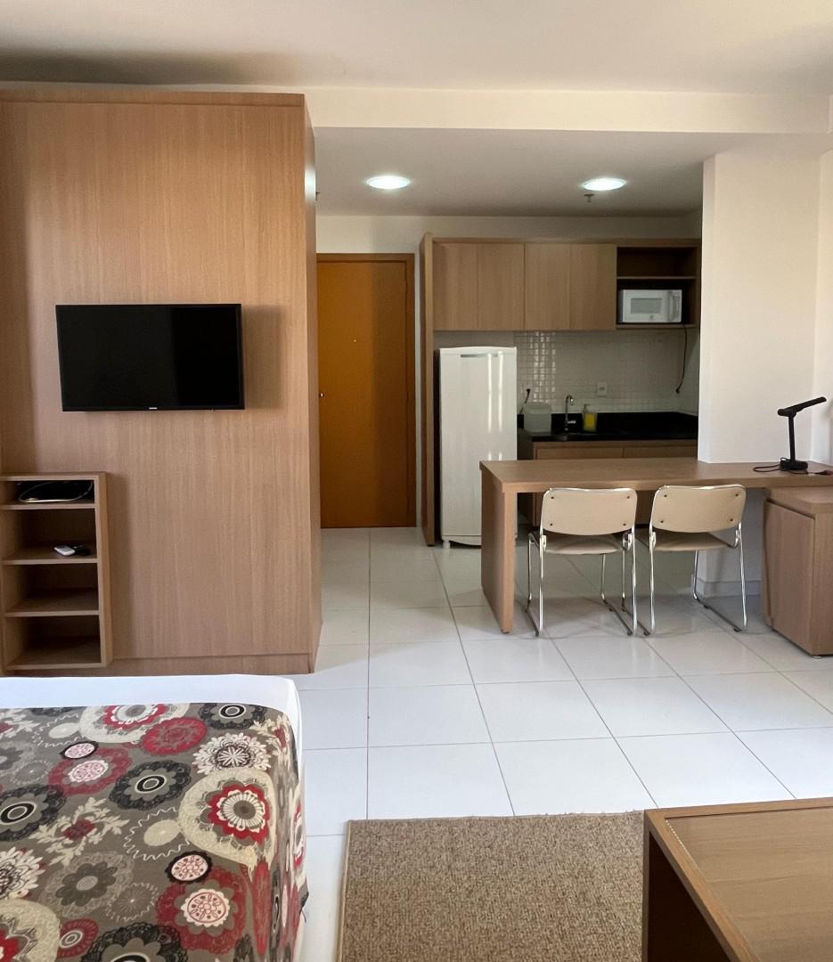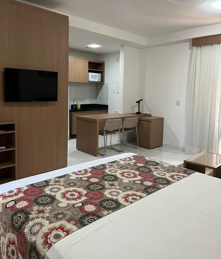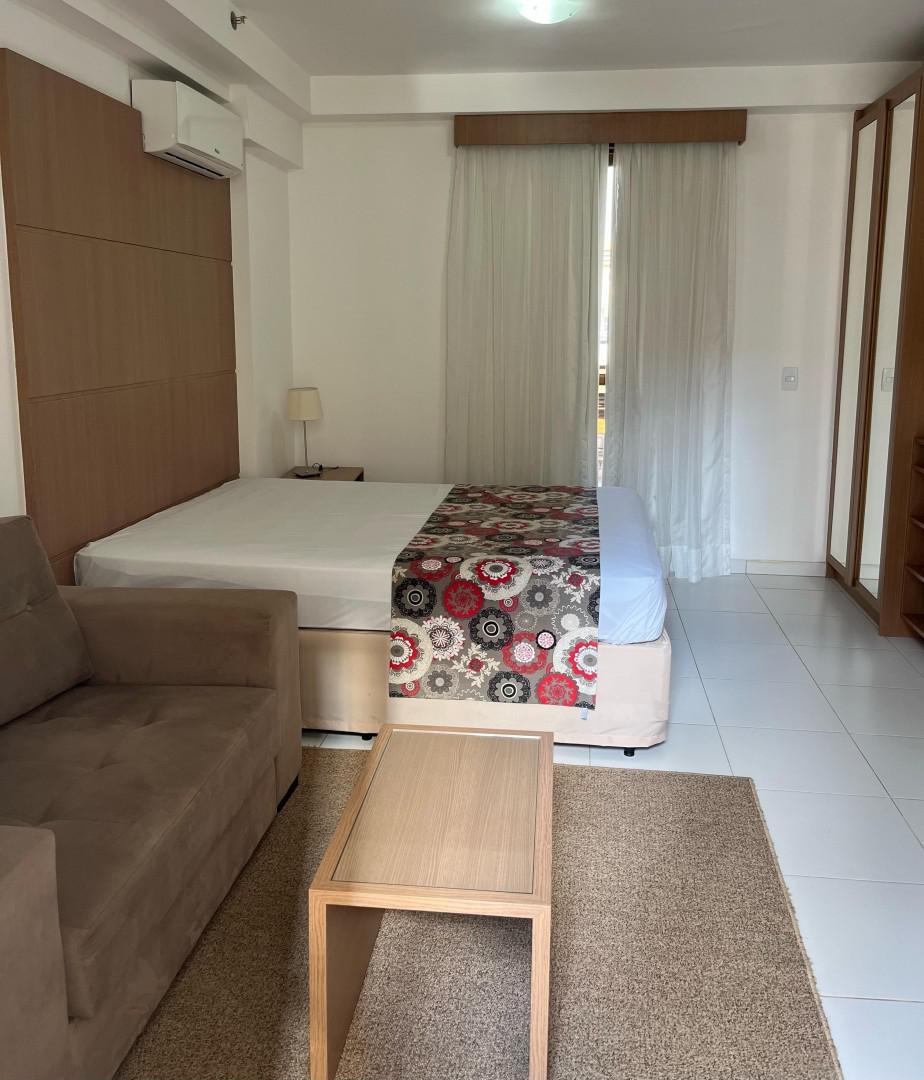 O apartamento conta com: Cama Box Casal, TV, Sofá, Ar-condicionado, Geladeira, Cooktop, Armários planejados no quarto, cozinha e banheiro