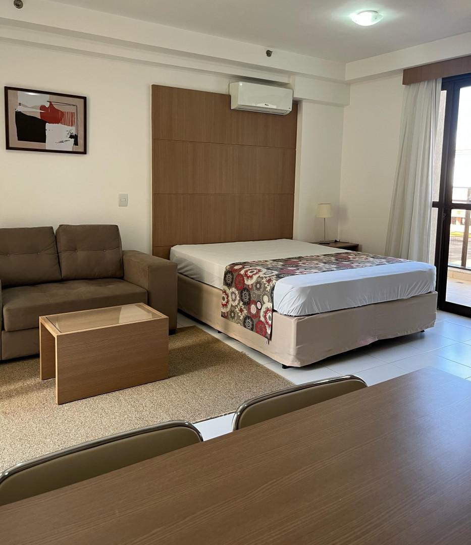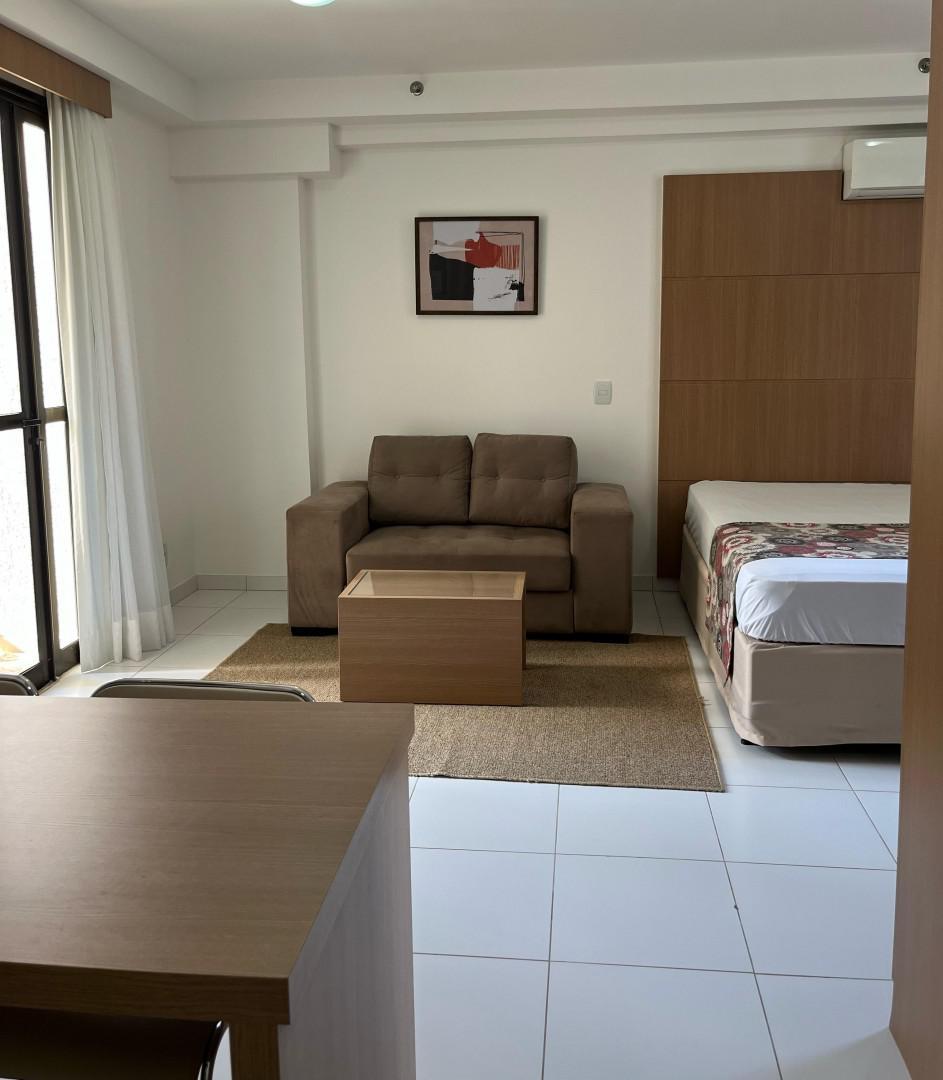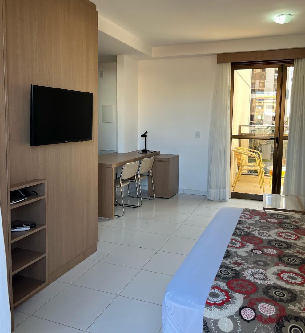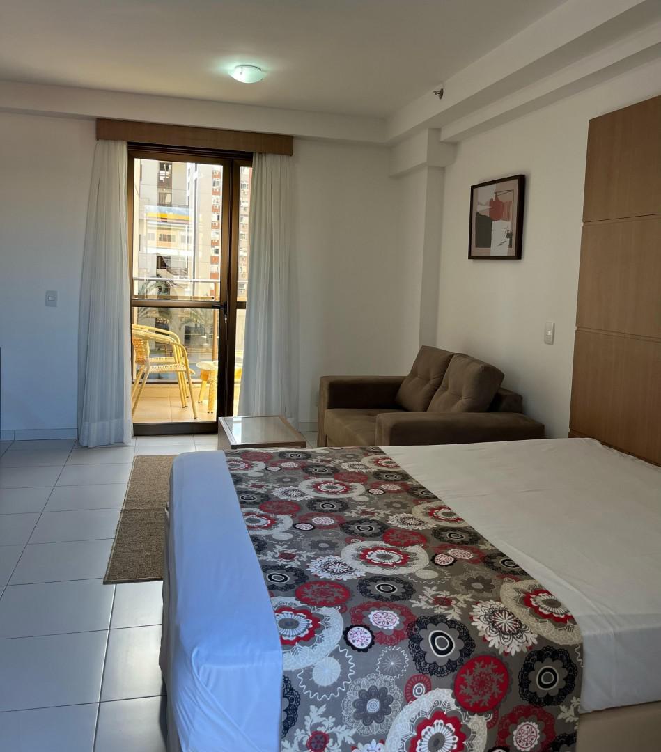 O apartamento conta com: Cama Box Casal, TV, Sofá, Ar-condicionado, Geladeira, Cooktop, Armários planejados no quarto, cozinha e banheiro