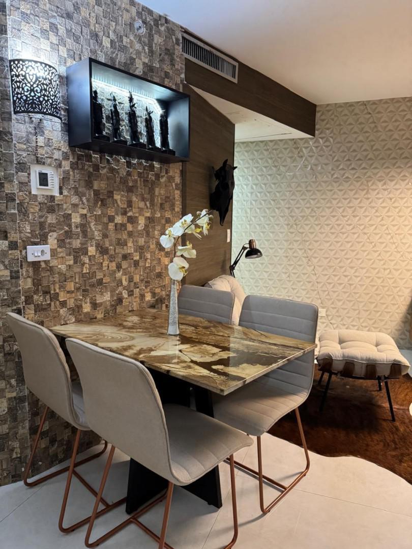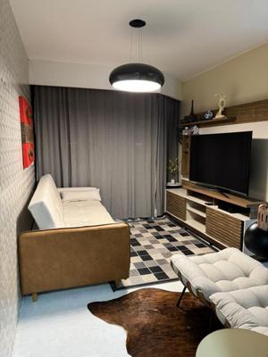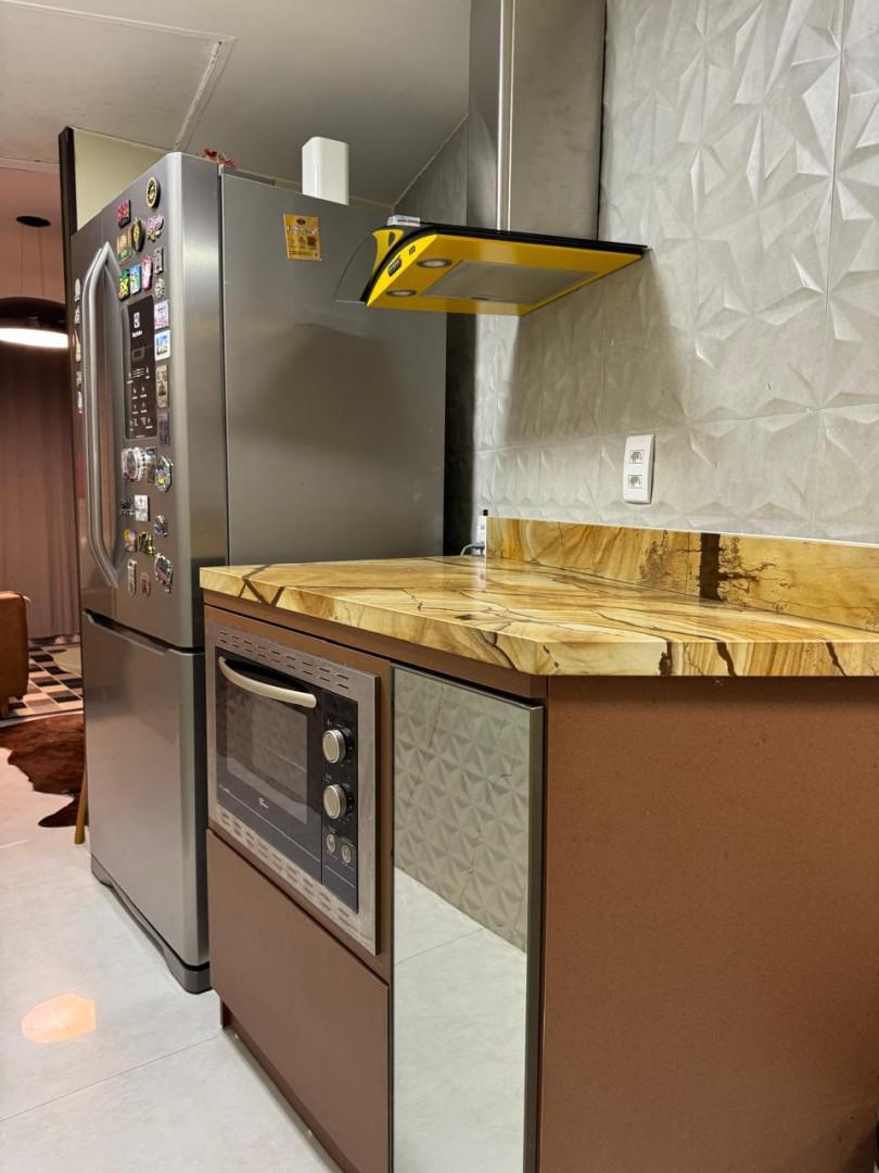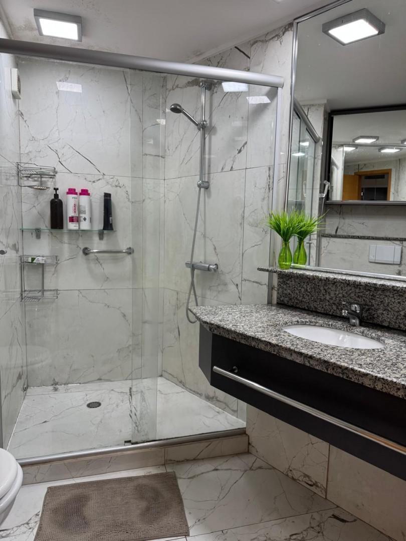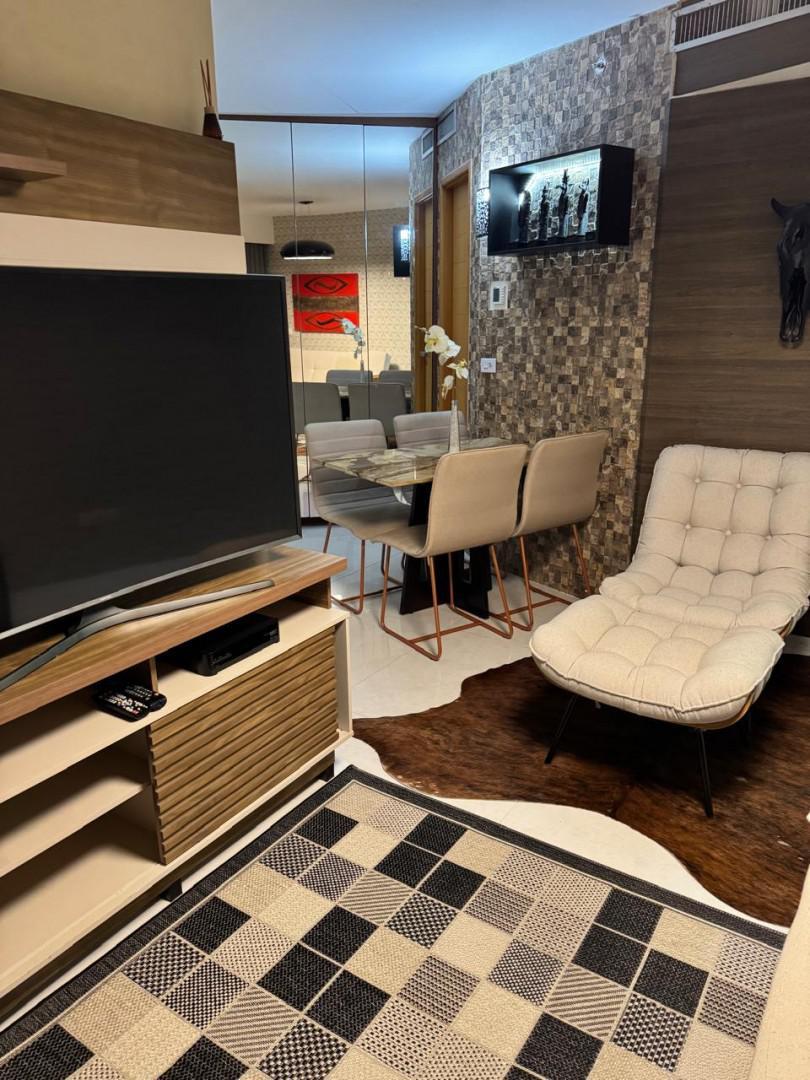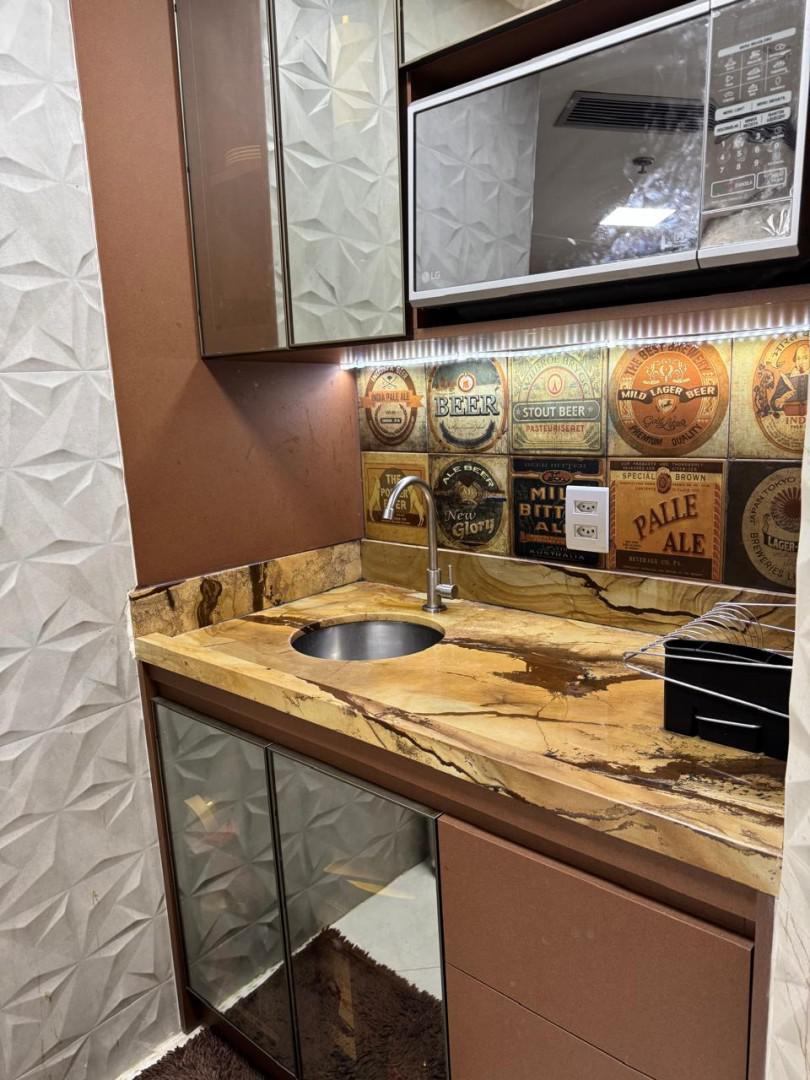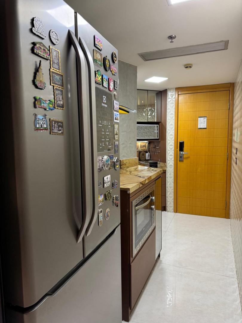 Todo em Porcelanato, paredes revestidas para proteção acústica, completamente mobiliado com Ar condicionado central, Geladeira Grande de 3 Portas, Forno Elétrico, Forno de Micro-ondas, 1 Quarto de casal e 1 de Solteiro, ambos com armários, camas (baú) e ventiladores de teto, TV Smart de 55", sofá para 4 lugares (também baú), mesa de jantar de granito com 4 lugares, Varanda com vista Belíssima e mesa para café/chá.