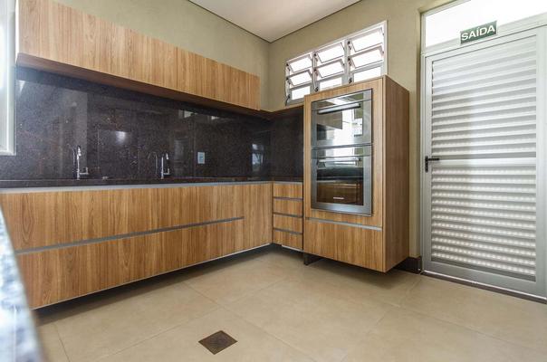 Cozinha e área de serviço: Piso em porcelanato 60 x 60 cm, soleira em granito, cozinha revestimento em porcelanato e cerâmica decorativa.